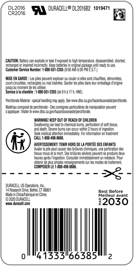 Experience reliable, long-lasting power with Duracell 2016 3V Lithium Coin Batteries, perfect for key fobs, car remotes, and more. Manufactured by the trusted DURACELL brand, these batteries feature a unique bitter taste coating and child-secure packaging for added safety. With a guaranteed 10-year shelf life and rigorous quality standards, they are a smart choice for everyday and emergency use. Choose Duracell for dependable performance and peace of mind.